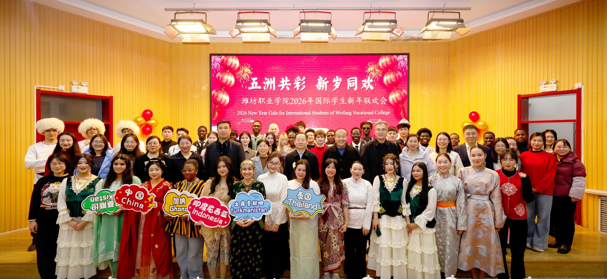 欢歌笑语辞旧岁,流光溢彩迎新年。12月30日下午,学院在奎文校区6号楼报告厅举办“五洲共彩 新岁同欢”2026年国际学生新年联欢会。学院党委书记王浩、副院长陈美霞出席,安全保卫处、机电工程学院、学生工作处相关部门负责同志参加活动,来自加纳、吉尔吉斯斯坦、俄罗斯、泰国等国家的80多名国际学生与国际教育学院全体教师欢聚一堂,共同迎接新年的到来。