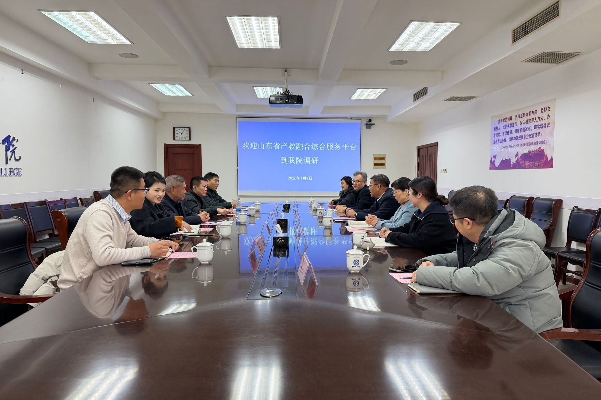 1月9日,山东省产教融合综合服务平台副主任王宪功一行5人来我院考察交流。学院院长韩瑞东、副院长陈美霞接待客人,国际交流与合作处、化学工程学院、农林科技学院相关负责同志参加座谈。