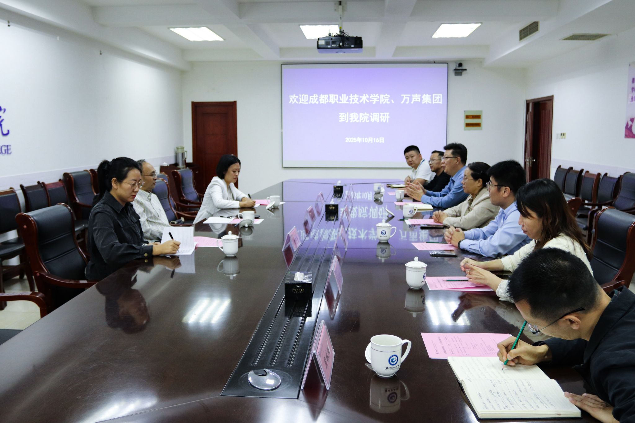 10月16日下午,成都职业技术学院党委委员、副校长任忠一行3人来我院考察,万声集团副总经理邱运乾陪同考察。学院党委委员高凌云陪同参观交流,文化创意学院主要负责同志及相关人员参与交流。座谈会前,任忠一行参观了潍坊市现代服务业产业学院实训基地,实地查看基地的设施配置、教学运行及校企合作实训开展情况,并对基地的建设水平和实践教学成效给予高度评价。座谈会上,考察团观看了潍坊职业学院宣传片,对学院的办学历史、学科建设、...更多 -