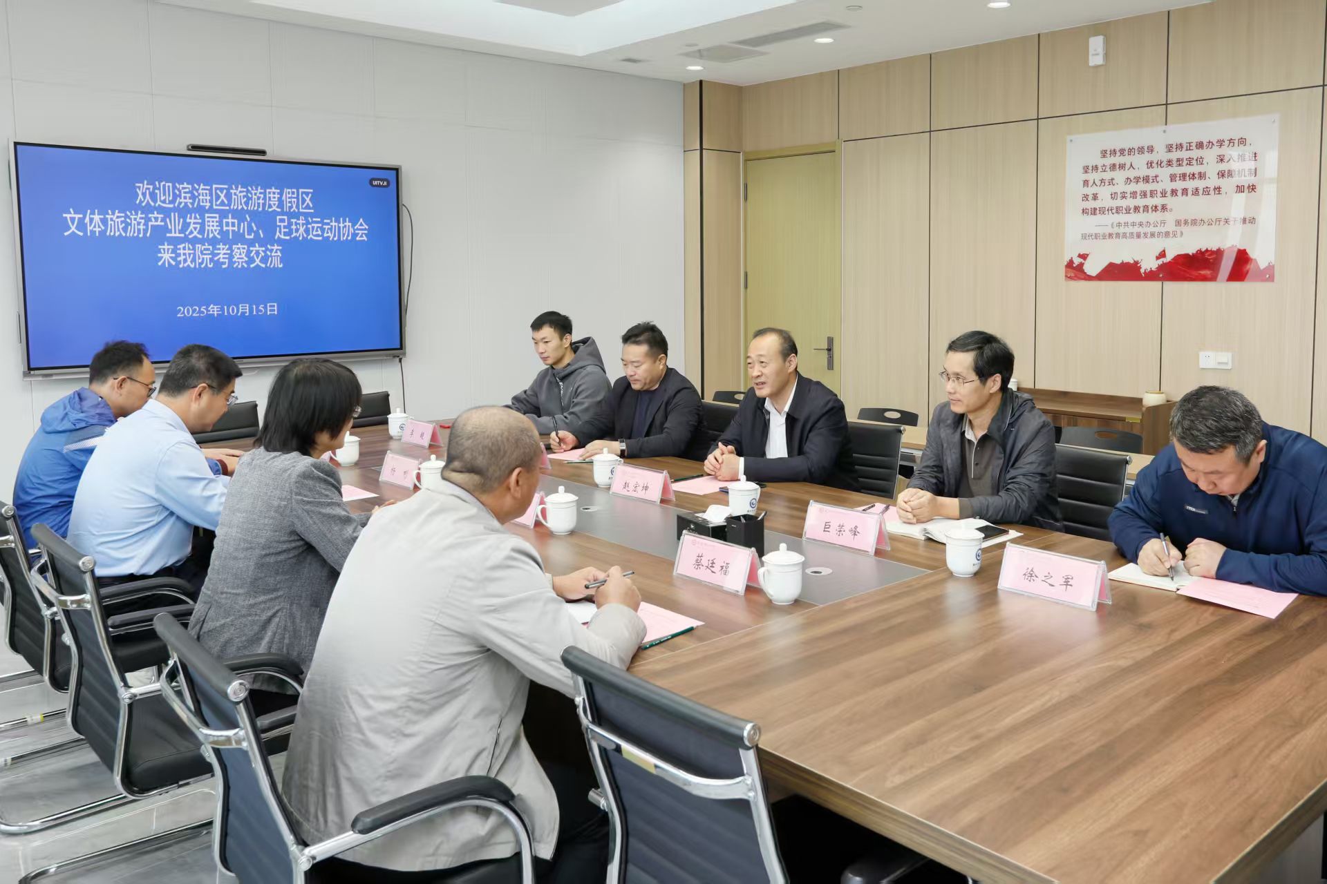 10月15日,滨海区旅游度假区党委书记冯月玲一行到访我院,就推动地方文体旅游事业与职业教育深度融合进行洽谈交流。学院党委委员、副院长赵宏坤出席并主持会议,通识教育中心党政负责同志及相关教师陪同会见并参与洽谈。洽谈会上,赵宏坤对冯月玲一行的到来表示欢迎,并介绍了学院近年来取得的主要成果,“建高升本”规划和进展情况,以及学院在通识教育、特别是体育育人方面的理念与成果。双方重点探讨了共建参赛球队出战潍坊市足球超级联赛事宜,...更多 -