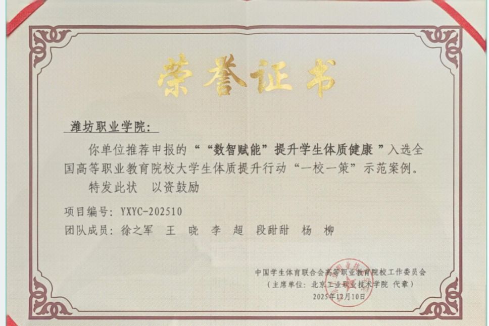 近日,中国学生体育联合会高等职业教育院校工作委员会公布结果,我院申报的《“数智赋能”提升学生体质健康》项目成功入选全国高等职业教育院校大学生体质提升行动“一校一策”示范案例,成为全国28所获此殊荣的高职院校之一,充分彰显了学院在体育育人改革领域的示范引领价值。本次遴选以贯彻落实全国教育大会精神为核心,紧扣《教育强国建设规划纲要(2024—2035 年)》《关于加强和改进新时代学校体育工作的意见》等文件要求,旨在推动高职院校体育工作高质量发展,...更多 -