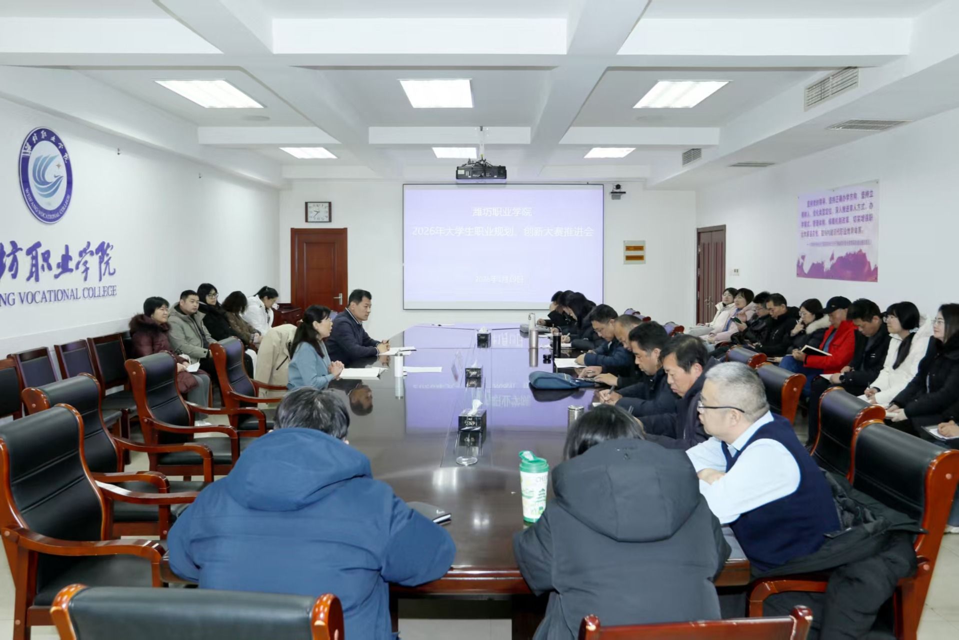 1月19日上午,学院在奎文校区召开2026年大学生职业生涯规划、创新大赛推进会,学院副院长陈美霞出席会议,招生就业处主要负责同志主持会议,各二级学院主要负责同志、分管副院长、大赛指导教师及相关人员参加会议。陈美霞指出,大学生职业生涯规划和创新大赛的核心出发点在于培养学生正确的成长观、成才观和就业观,要引导学生站在更高的角度规划自己的人生,在选择职业或岗位时要与国家战略相结合,服务区域经济和社会发展。她围绕比赛参赛备赛工作提出具体要求:...更多 -