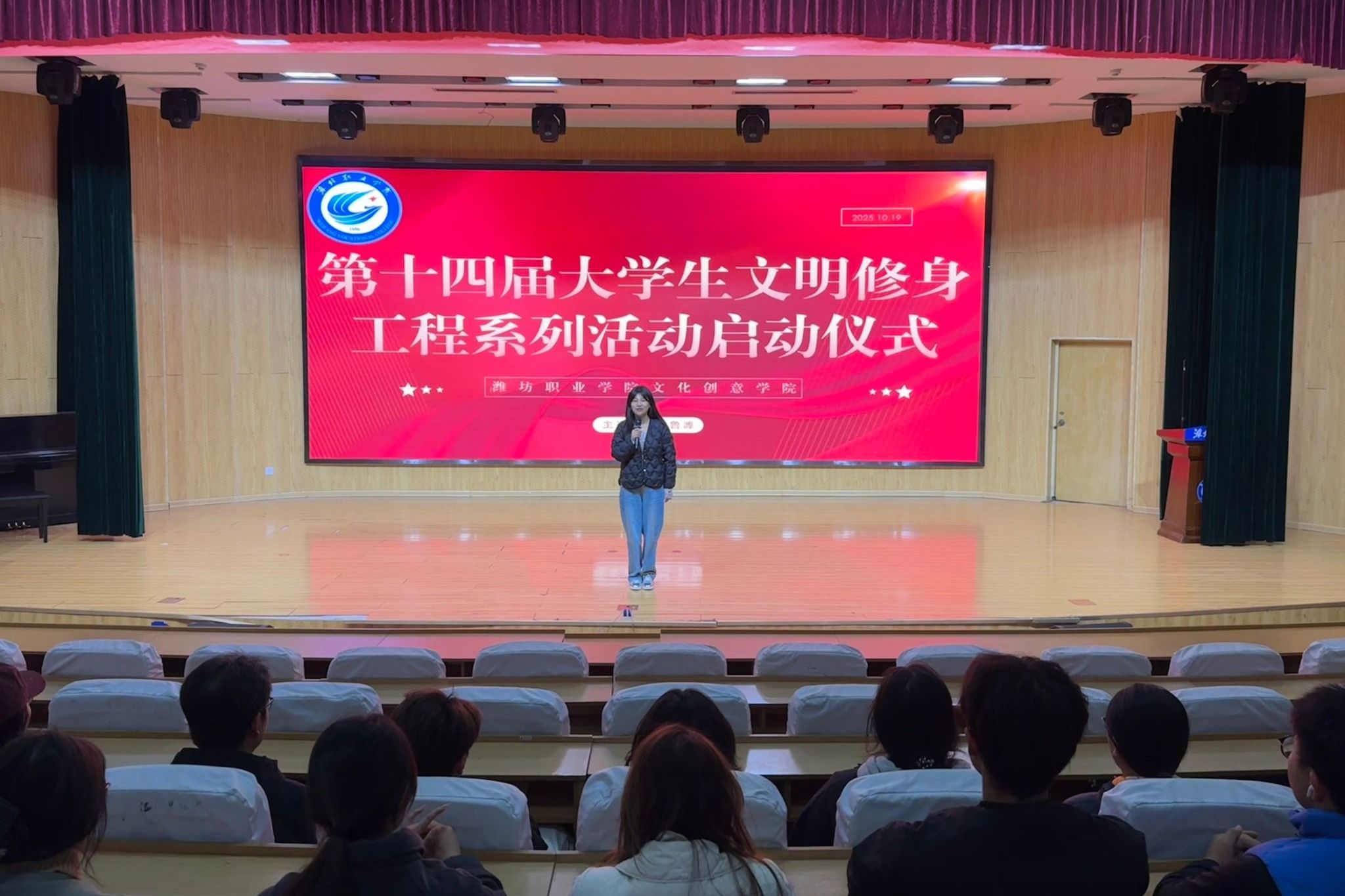 为进一步提升学生思想道德素质和文明素养,促进学生德智体美劳全面发展,10月20日,文化创意学院在奎文校区16号楼报告厅举办第十四届大学生文明修身工程系列活动启动仪式。启动仪式上,相关活动负责老师围绕“明德修身,知行合一”活动主题,阐述了本次活动的主要内容;随后,深入剖析了活动对学生成长成才的重要意义,强调文明修身不仅是个人品德修养的提升,更是未来走向社会、实现人生价值的重要基石。学生代表在仪式上宣读《大学生文明修身倡议书》...更多 -