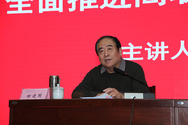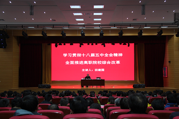 报告会上,田建国为我院干部教师作了题为“学习贯彻十八届五中全会精神全面推进高职院校综合改革”的报告。报告围绕学习贯彻党的十八届五中全会精神主题,以创新驱动发展等国家战略实施为背景,重点从推进教育观念改革、创新创业教育改革、人才培养机制改革、教学改革、人事分配综合改革等方面阐述了全面推进高职院校综合改革培养创新型人才的必要性和重要性。报告通过大量鲜活生动的教育案例,通过传统与现代教育的对比和中外教育对比,生动形象地介绍了新形势下高职高专改革,特别是教学改革的方向、内容与途径。报告引经据典,深入浅出,既有理论性,也有操作性;既有现实性,也具前瞻性,使与会干部教师深受启发,深受教育。