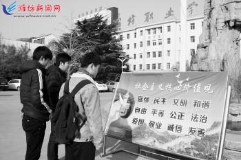 2014年12月30日,潍坊职业学院的学生在校园内观看社会主义核心价值观展板。连日来,我市各大高校紧紧围绕社会主义核心价值观24字基本内容展开宣传教育,引导青少年更加深刻真切地理解社会主义核心价值观的意义内涵,激发学生的爱国主义热情,弘扬民族精神,促进学生健康成长。