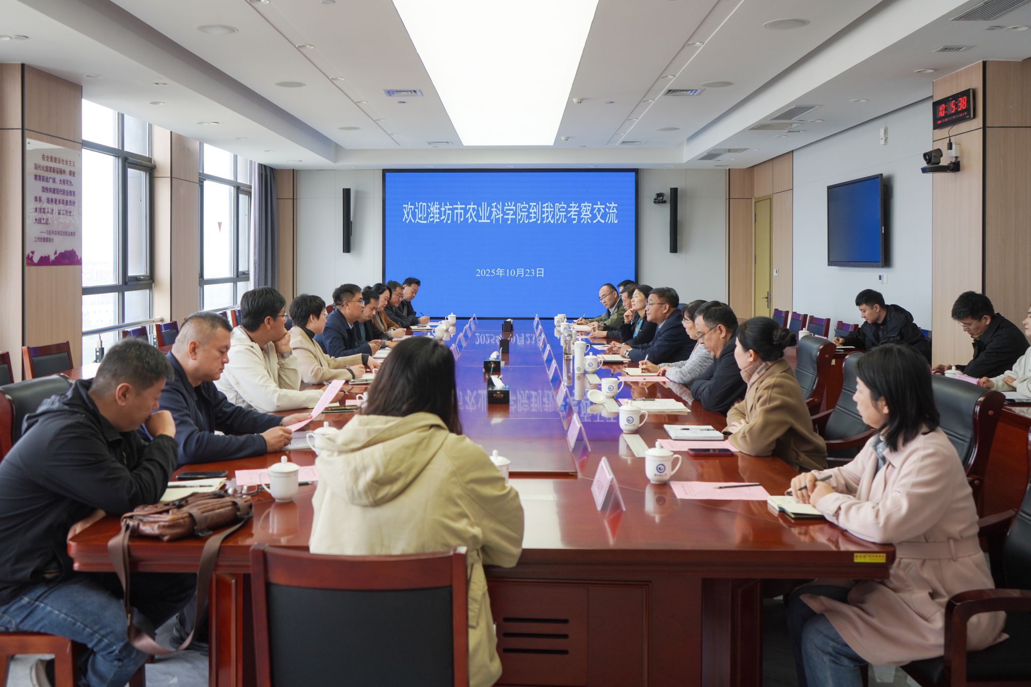 10 月 23 日,潍坊市农业科学院院长袁柳天、副院长付春及相关研究所负责人一行10人莅临我院交流访问。学院院长韩瑞东,副院长陈美霞,党委委员、办公室(统战部)主任(部长)刘志艳,科技处负责同志,农林科技学院党政负责同志及相关教师参加座谈交流。