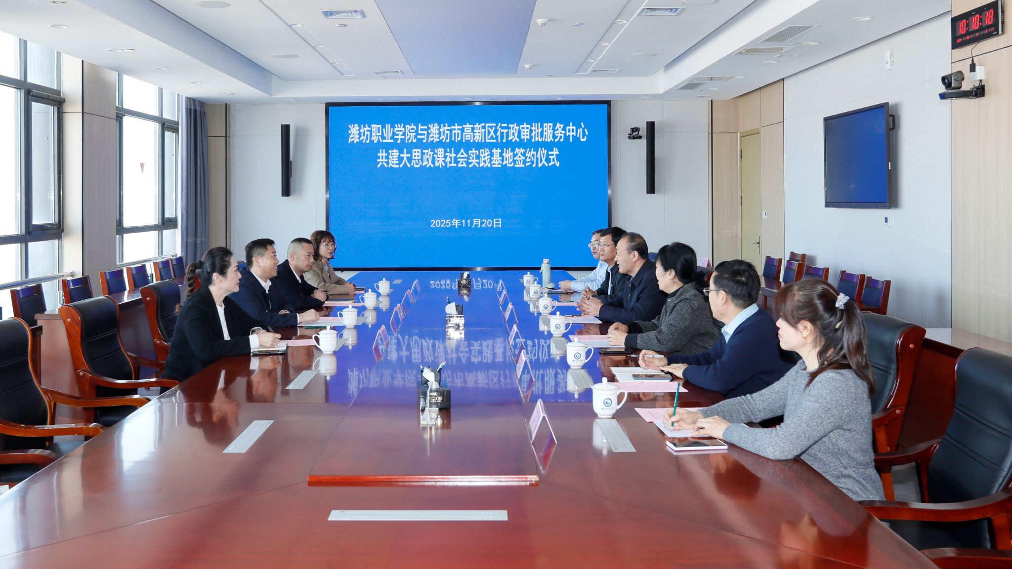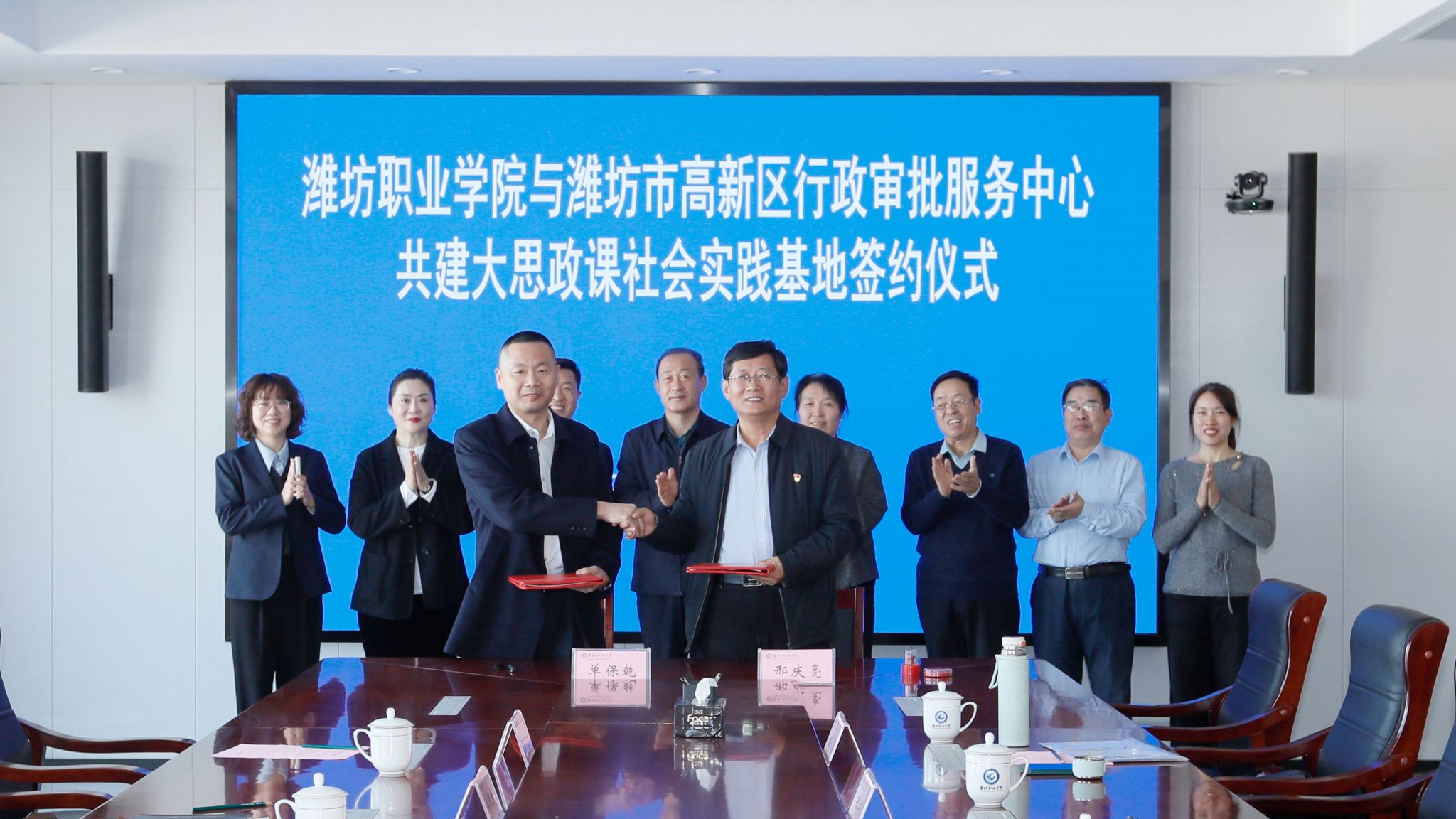 11月20日上午,学院与潍坊高新区行政审批服务中心共建大思政课社会实践基地签约仪式在滨海校区举行。学院党委委员、副院长赵宏坤,潍坊高新区行政审批服务中心主任、昌潍农校1994级校友陈传刚出席签约仪式,党委委员、宣传部部长鞠桂芹主持签约仪式。潍坊高新区行政审批服务中心副主任单保乾、马克思主义学院负责同志及相关科室负责人参加活动。