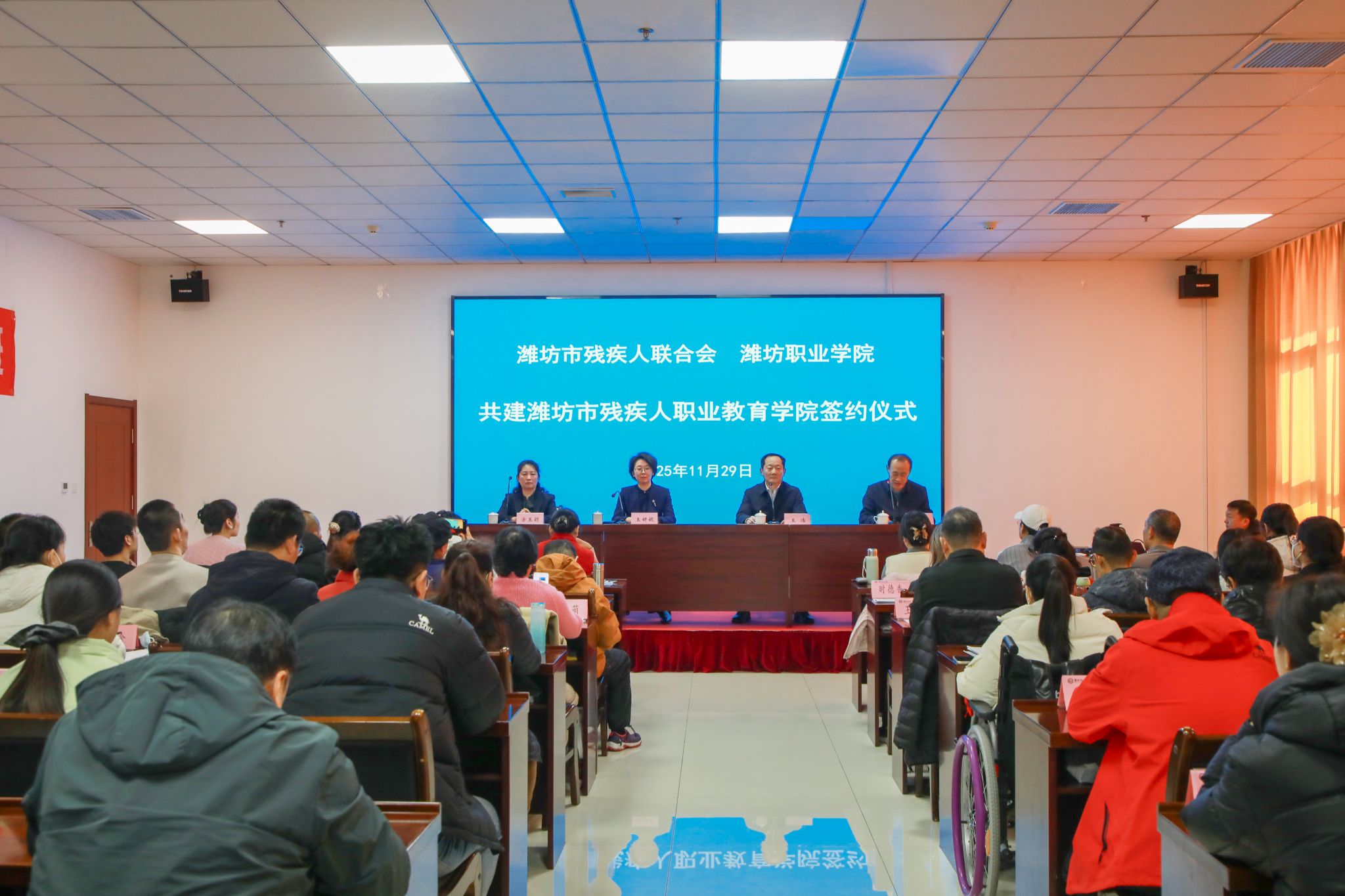 11月29日,潍坊职业学院与潍坊市残疾人联合会共建潍坊市残疾人职业教育学院签约仪式在潍城区委党校举办。学院党委书记王浩,党委委员、副院长赵宏坤,潍坊市残联党组书记、理事长王妍妮,教育就业部主任、四级调研员方玉颖出席签约仪式。潍坊市残疾人代表及助残公益人士共计60余人参加仪式。
