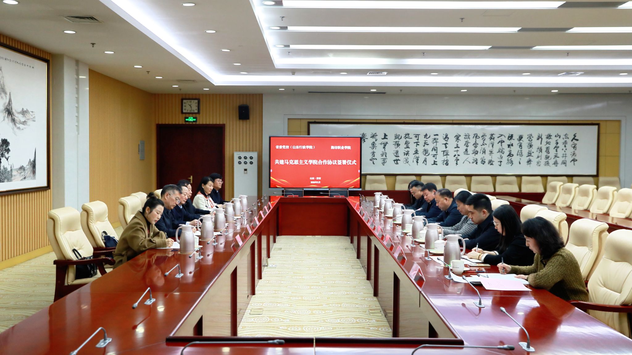 3月11日,学院党委书记王浩带队到中共山东省委党校(山东行政学院)签署共建马克思主义学院合作协议。中共山东省委党校(山东行政学院)主持日常工作副校(院)长白皓会见王浩一行,党委副书记贺志强代表学院签订合作协议,党委委员、副院长任培华,党委委员、办公室(统战部)主任(部长)刘志艳出席签约仪式,教师工作部、马克思主义学院负责同志参加活动。
