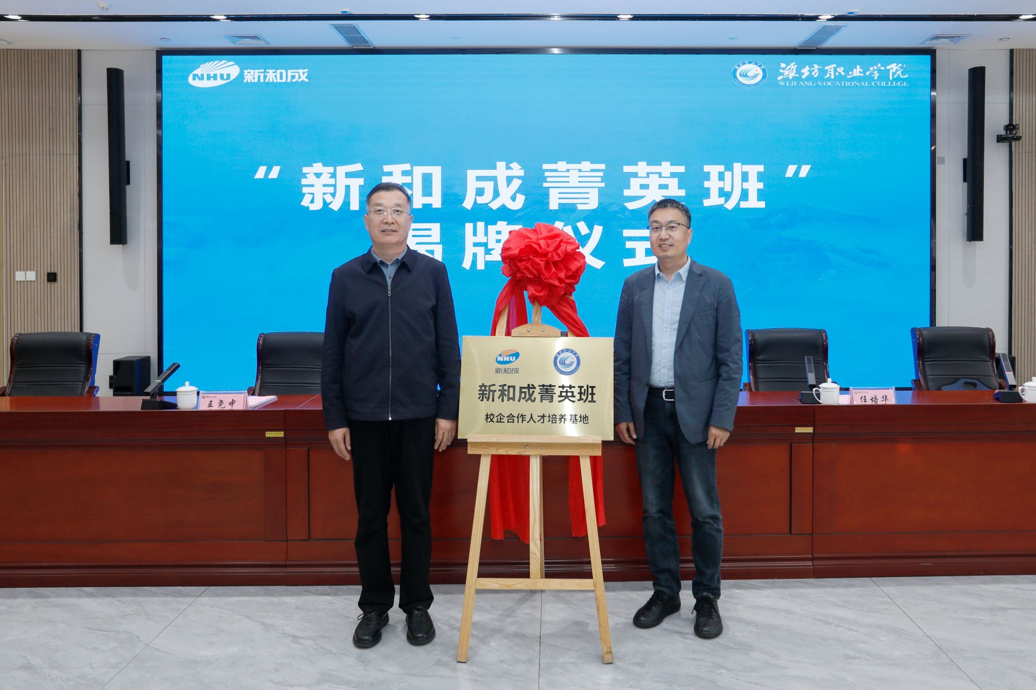 在全体与会人员见证下,任培华与孟建波共同为“新和成菁英班”揭牌。随后,全体人员合影留念。