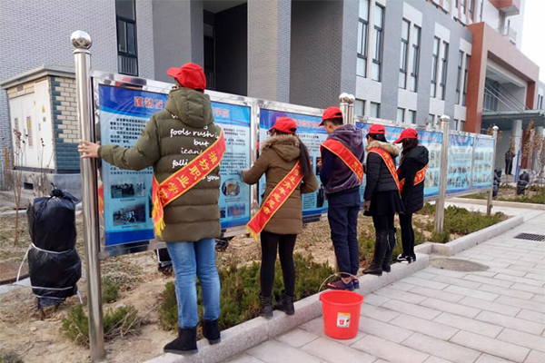 各团支部通过新媒体、专题板报的形式,从“行为文明、仪表文明、语言文明、环境文明、安全文明”等方面配合上生动的图文,发起了用行动传递精神、用爱心装点校园的倡议和宣传。晚自习期间,各团支部举行了“文明有我,我为校园献力量”的主题班会,各班同学积极发言,立志争做文明大学生,为创建文明校园做出贡献。该院“青春飞扬”志愿者佩戴绶带,对校园操场、人工湖、食堂等处进行了全面清洁,在餐厅规范就餐秩序。
