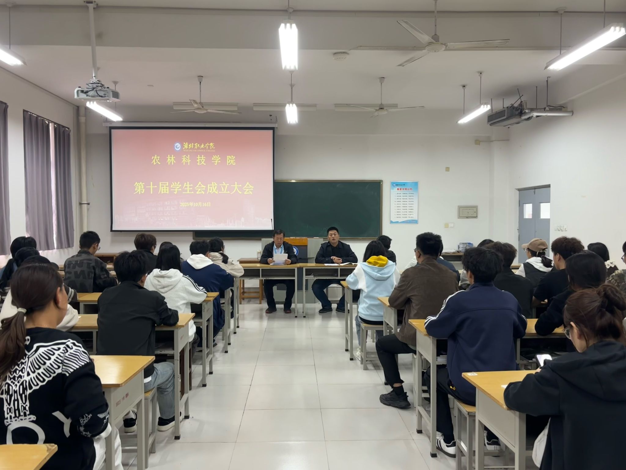 10月16日,潍坊职业学院农林科技学院第十届学生会成立大会在惠泽1号楼 B216 召开。农林科技学院党总支书记、全体辅导员、第十届学生会全体成员及在校生3个年级的班长参加会议。