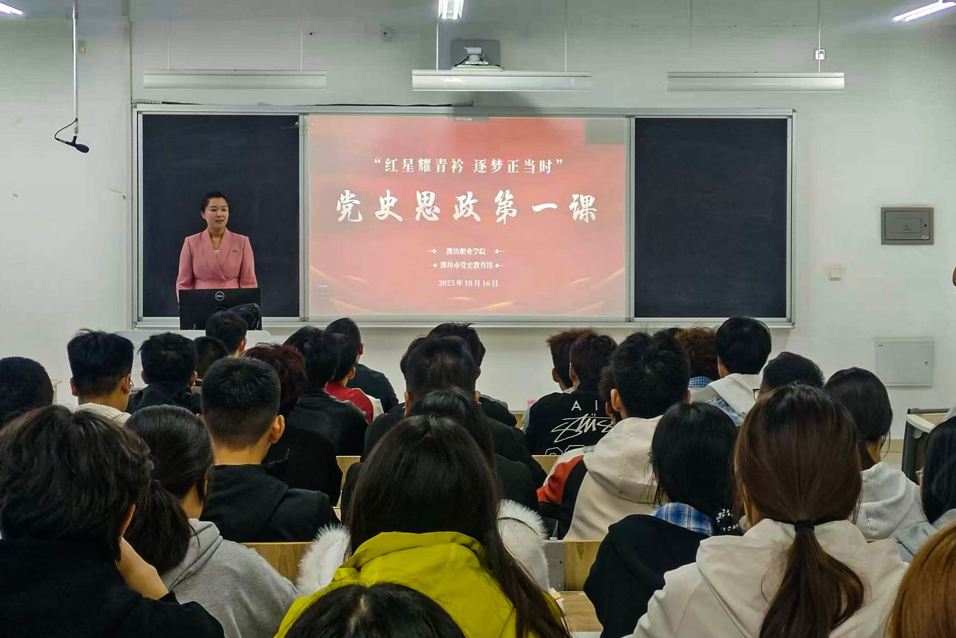 为深入贯彻落实习近平总书记关于党史学习教育的重要指示精神,充分发挥潍坊红色资源育人功能,10月16日,学院联合潍坊市党史教育馆开展“党史思政第一课”活动。潍坊市党史教育馆王鑫、张浩磊为学生授课,滨海校区2025级学生代表在智泽楼主会场参与现场学习,其余学生通过钉钉直播线上同步观看。马克思主义学院党支部负责人主持活动。