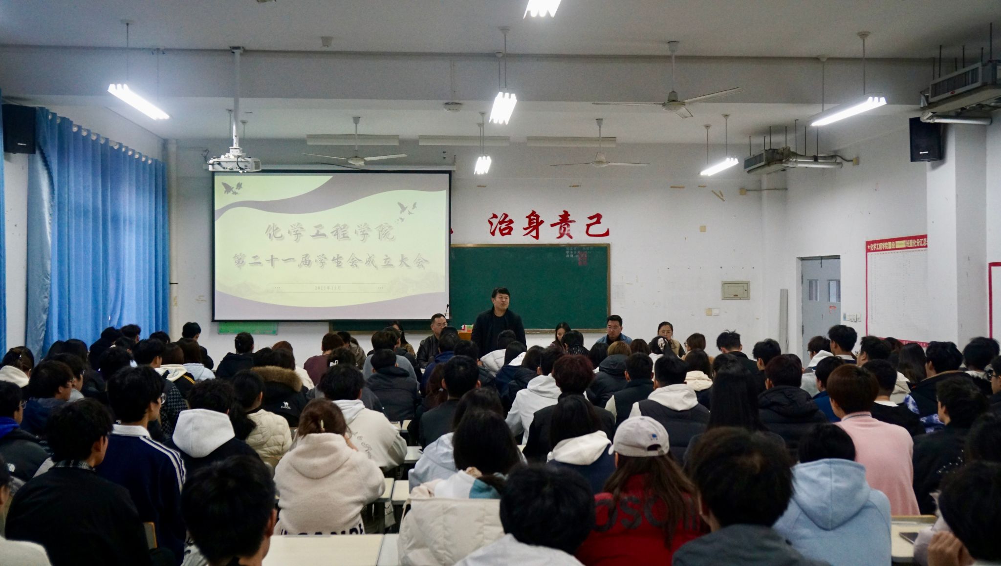 11月10日,化学工程学院在惠泽1A412教室举行第二十一届学生会成立大会。学院党总支负责人、专职辅导员以及新一届学生会全体成员参加会议。