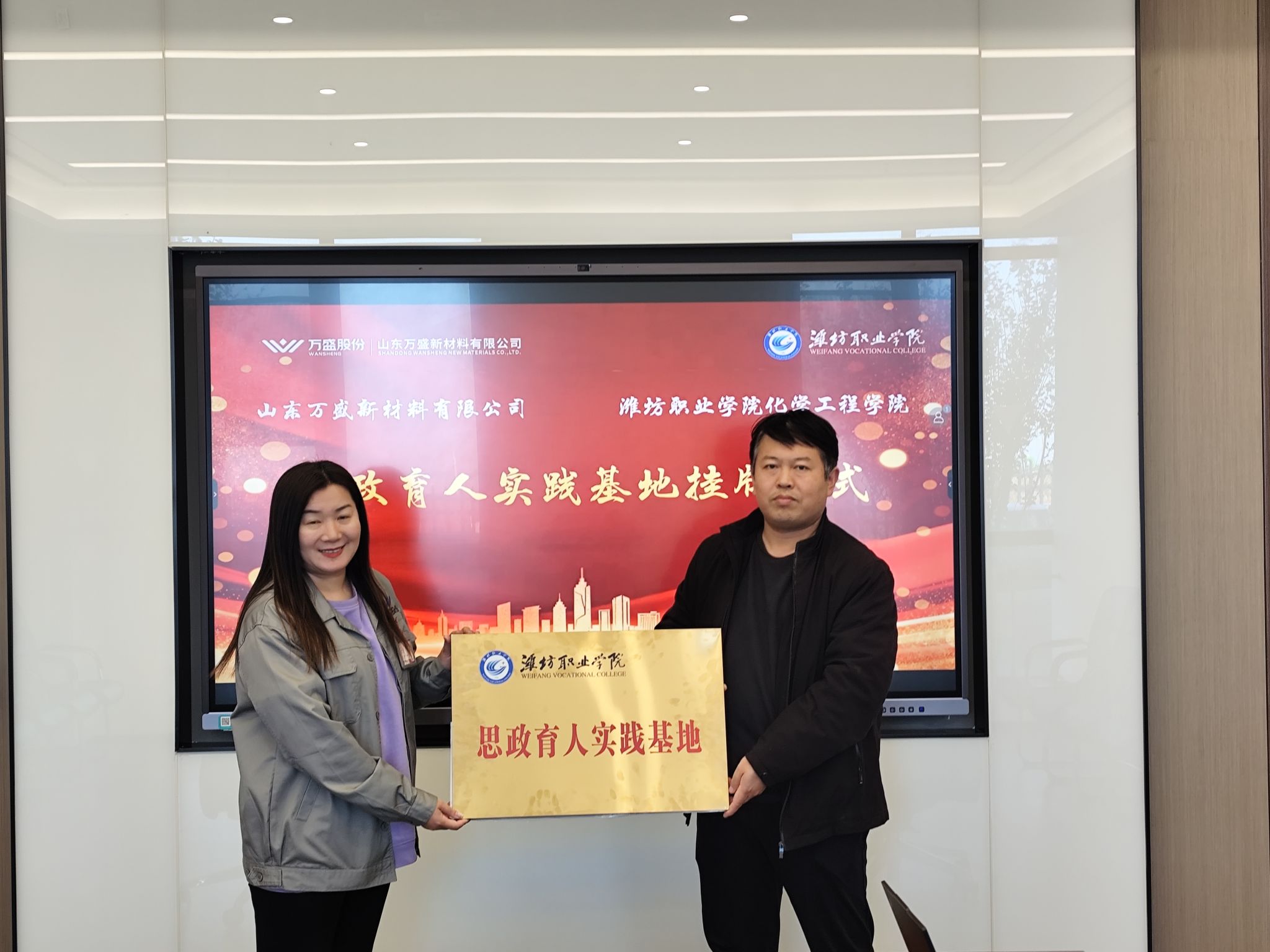 活动期间,化学工程学院党总支负责同志和企方开展拓岗就业专项交流,深入探讨人才培养与企业需求的对接路径。在山东万盛新材料有限公司党建教育基地,校企双方共同举行“思政育人实践基地”挂牌仪式,为协同育人搭建了新的平台。此外,师生们先后参观了两家企业的展厅,系统了解了企业的发展历程、核心技术与战略规划。通过近距离感受企业严谨务实的工作氛围和追求卓越的质量文化,同学们对劳动精神与工匠精神的内涵有了更为深刻和直观地认知。