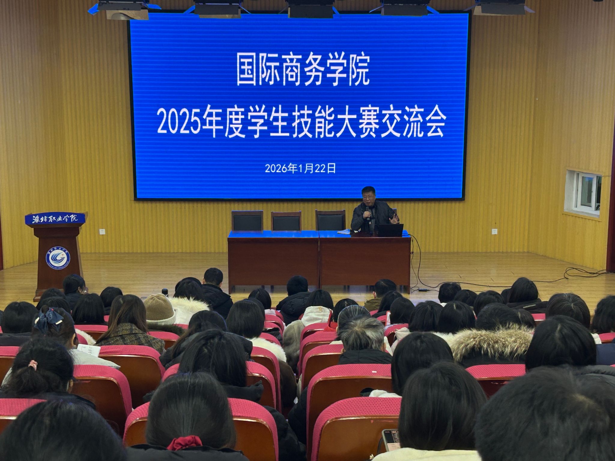 1月22日上午,国际商务学院召开2025年度学生技能大赛交流会,全面回顾全年赛事成果,表彰先进团队,并围绕2026年备赛工作进行动员部署,全体教职工参会。
