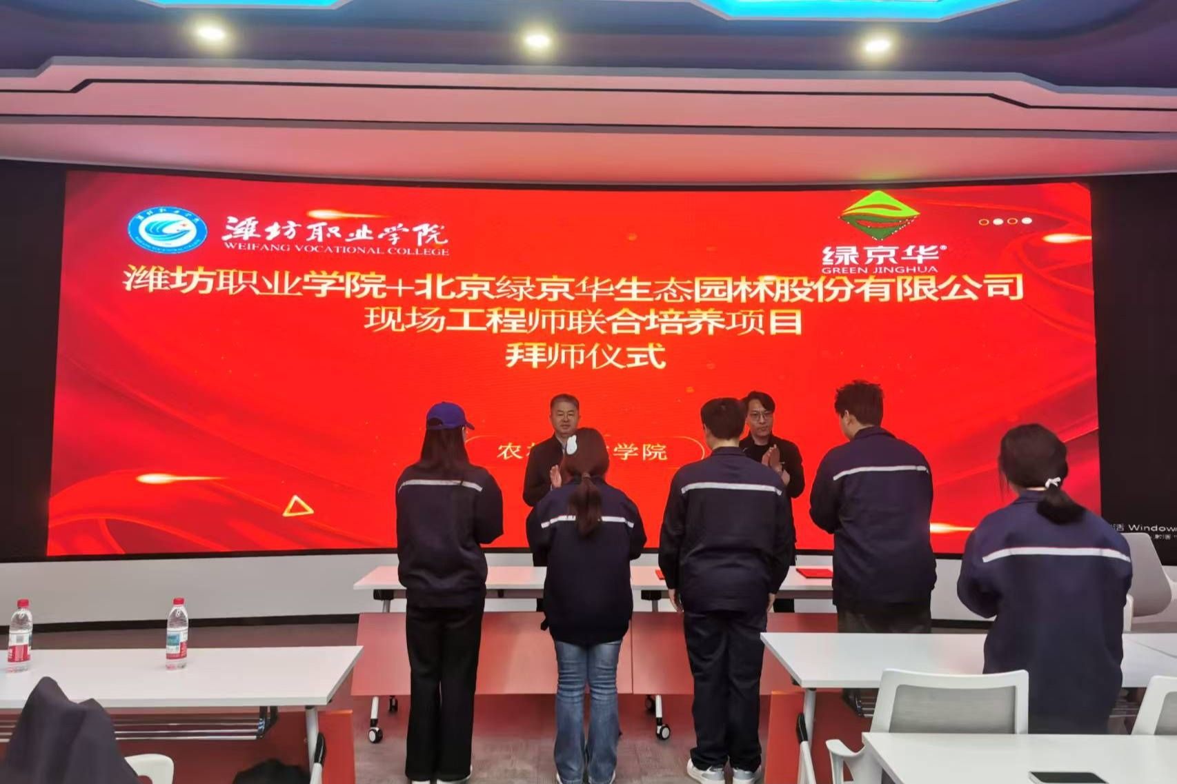 为进一步深化产教融合,扎实推进与北京绿京华生态园林股份有限公司合作的现场工程师联合培养项目落地见效,夯实校企协同育人根基,近日,农林科技学院于滨海校区正式举行现场工程师项目拜师仪式。北京绿京华生态园林股份有限公司董事长李夺、设计院院长尹桂彬出席本次仪式,农林科技学院负责人及园林技术专业部分师生共同参加活动。