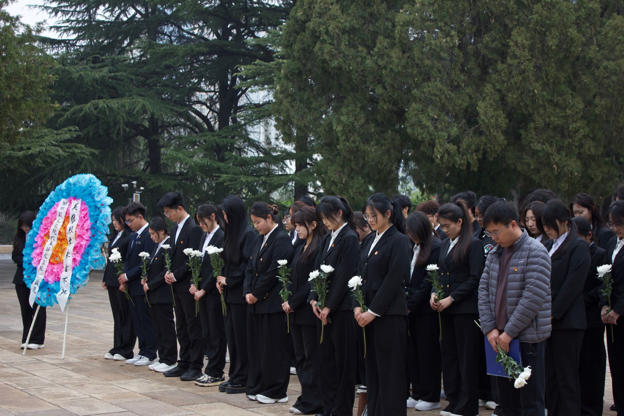 活动伊始,全体师生整齐列队,在庄严肃穆的氛围中奏唱国歌、肃立默哀,向革命先烈致以崇高敬意。随后,师生代表向烈士敬献花圈与鲜花,并重温入团誓词,在铿锵誓言中进一步坚定理想信念。教师与学生代表依次发言,号召大家铭记历史、坚守初心,将爱国之情转化为兴农报国的实际行动。仪式结束后,全体人员瞻仰烈士墓碑、参观烈士墓区,通过现场讲解重温革命先辈的奋斗历程,深刻感悟先烈精神。