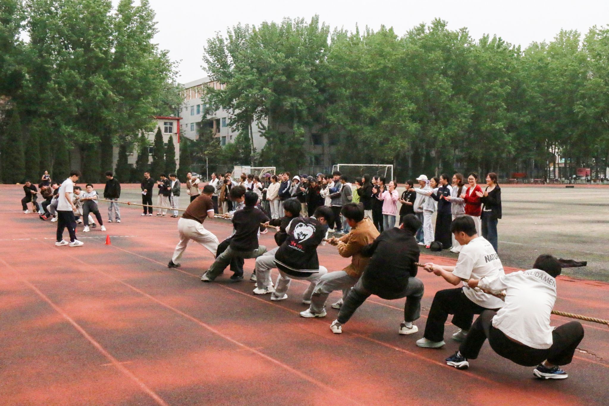 本次运动会精心设置三大特色项目,将趣味性与协作性深度融合。“一圈到底”项目中,10名队员手拉手紧密围圈,凭借默契配合与节奏把控,让呼啦圈稳稳传递至每一位队员,充分考验团队协作能力;“六人七足”项目里,6名队员并排站立、紧紧绑牢相邻脚踝,伴着整齐划一的口号同步前行;最具感染力的“阳光拔河”项目,每队20名队员凝心聚力、紧握长绳、奋力后拉,现场呐喊声、助威声震耳欲聋,将活动气氛推向顶峰。参赛学生纷纷表示,趣味运动会不仅有效舒缓了紧张的学习压力、放松了身心,更在并肩协作中拉近了距离,加深了彼此的信任与情谊。