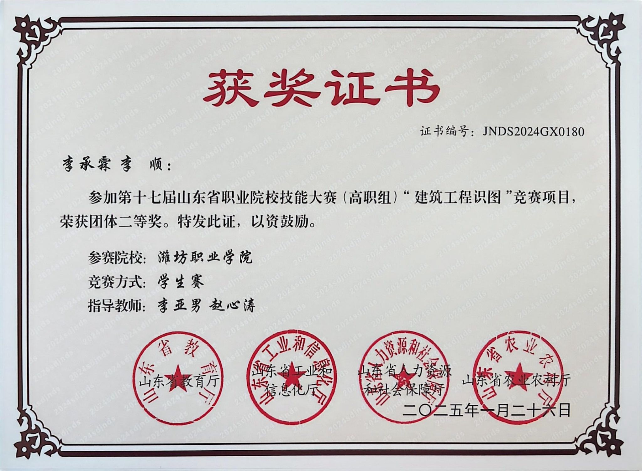 第十七届山东省职业院校技能大赛(高职组)“建筑工程识图”竞赛项目二等奖