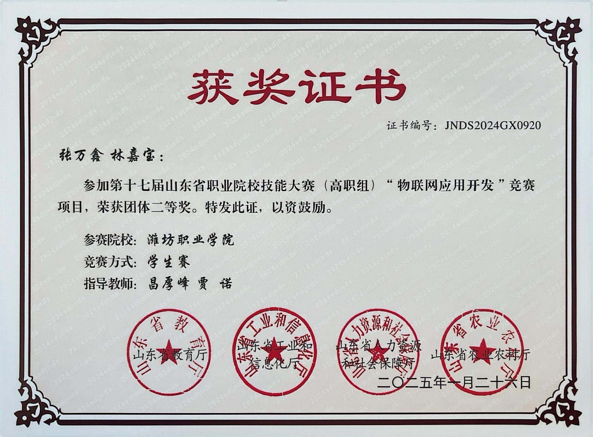 第十七届山东省职业院校技能大赛(高职组)“物联网应用开发”竞赛项目二等奖