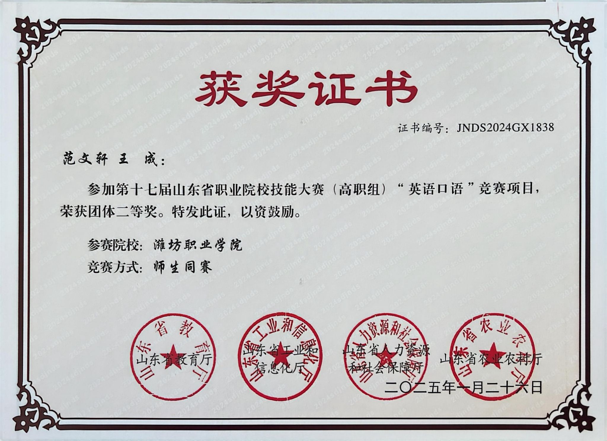 第十七届山东省职业院校技能大赛(高职组)“英语口语”竞赛项目二等奖